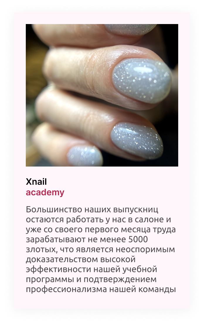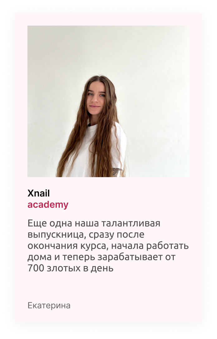 ◦ После курса вы точно улучшите качество своих работ, ускоритесь в маникюре, поднимете прайс и начнете зарабатывать больше.